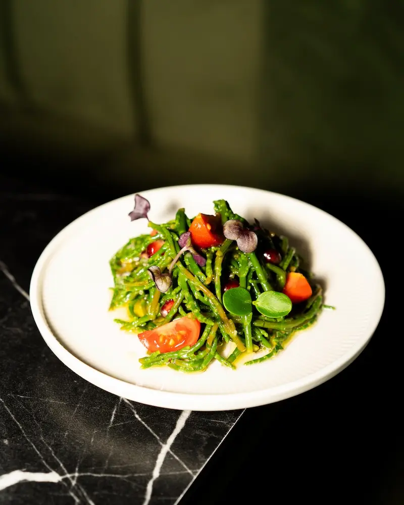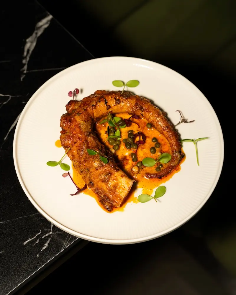 Avokado, geröstete rote Paprika, marinierter Wolfsbarsch, Basilikum-Espuma