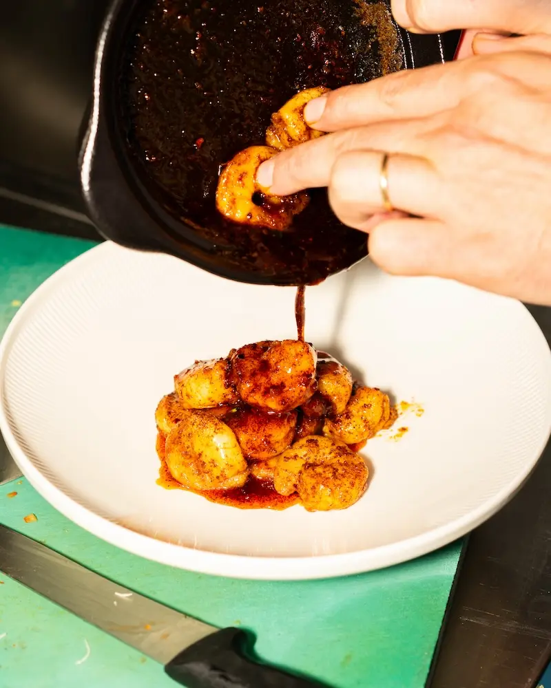 Knusprige Linsenbällchen, Sellerie-Kompott, Rote Bete, eingelegte Pilze, Yuzu-Gelee